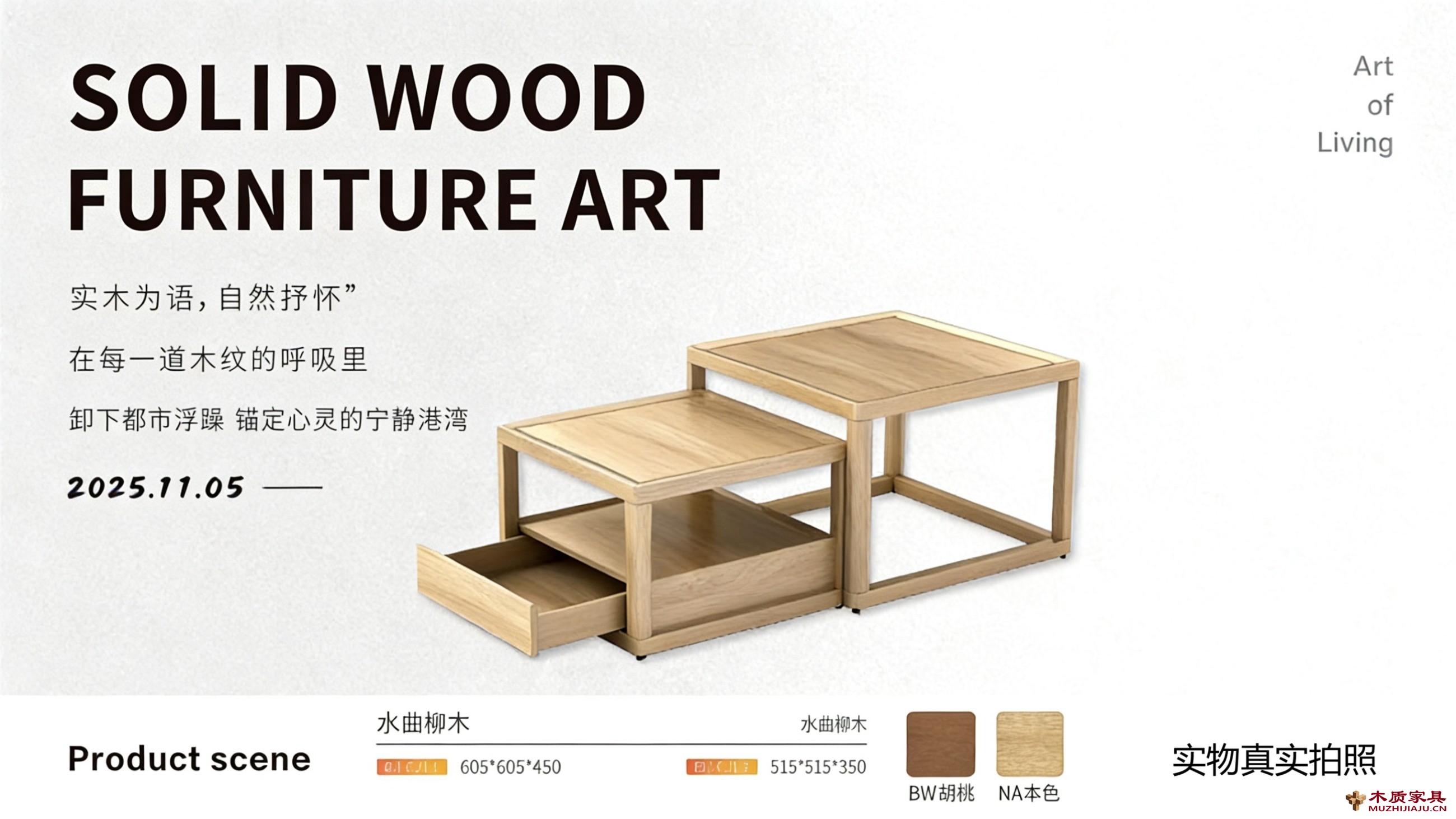 605X605X450与515X515X350的双尺寸设计,适配不同户型的客厅格局,BW胡桃的沉稳、NA本色的清新两种木色选择,亦能与各式家居风格相融。午后的阳光洒在茶几表面,原木的肌理在光影中愈发细腻,泡一壶清茶,倚在沙发上翻卷阅读,指尖划过实木的微凉触感,浮躁的心绪便在这自然的环抱里慢慢沉淀。