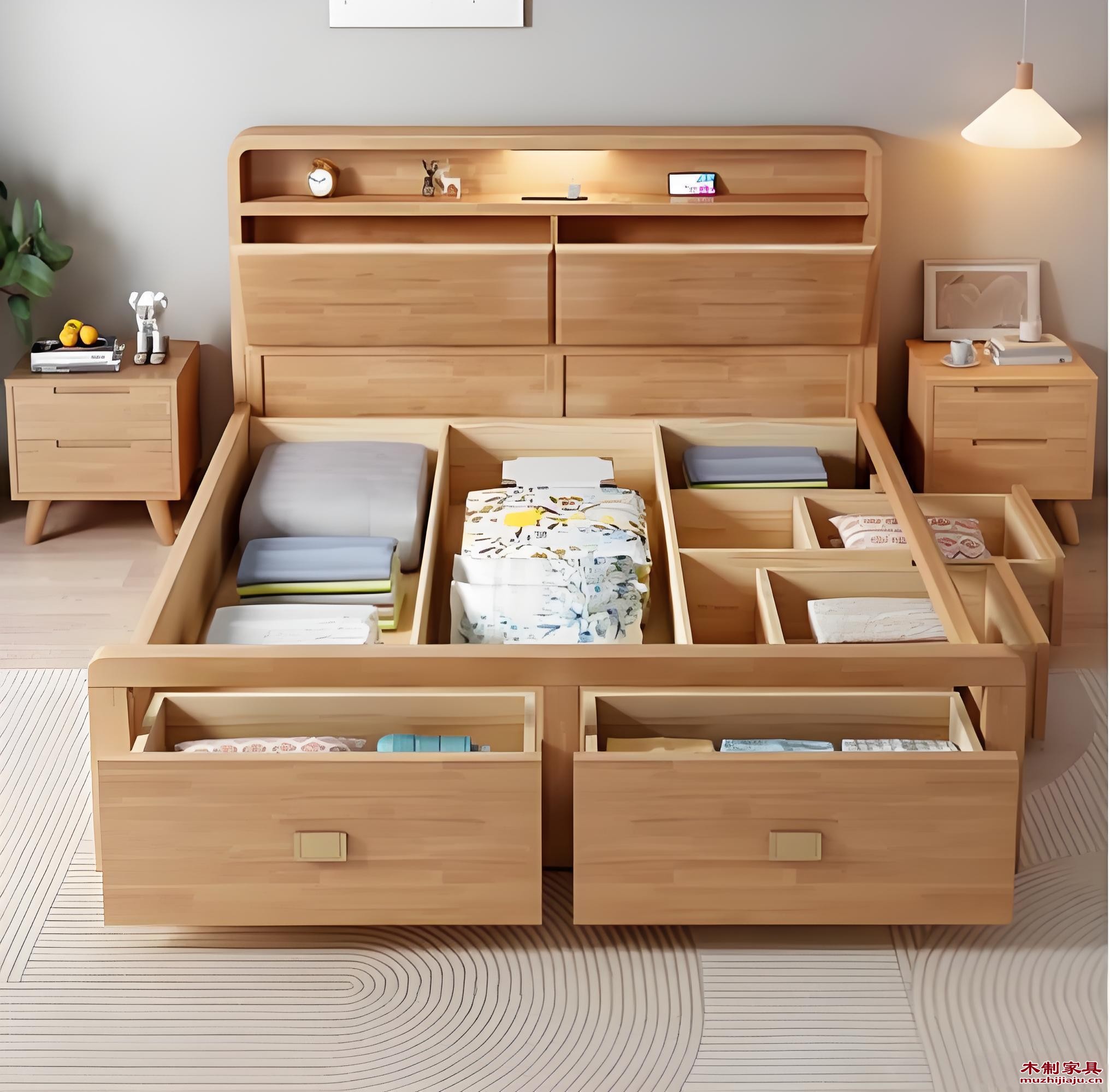 原木风多功能储物实木双人床产品介绍这款实木双人床聚焦空间利用与人性化体验,将原木质感与强大储物、智能细节结合,是现代卧室的实用之选,核心亮点如下:1. 多元储物系统床体侧边设有大尺寸抽拉式储物抽屉,可收纳被褥、换季衣物、闲置床品等大件物品,轻松释放衣柜空间;抽屉分区设计,分类收纳更规整,开合顺滑不卡顿。2. 智能便捷床头设计床头板集成开放式置物格与充电接口,睡前可放置手机、平板、书籍等小物件,充电